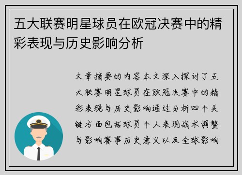 文章摘要的内容:本文深入探讨了五大联赛明星球员在欧冠决赛中的精彩表现与历史影响。通过分析四个关键方面,包括球员个人表现、战术调整与影响、赛事历史意义以及全球影响力,揭示了这些球员在决赛舞台上的独特贡献与传奇地位。