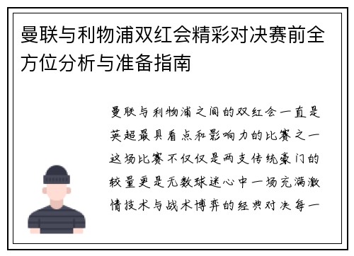 曼联与利物浦的双红会,一直是英超最为激烈和充满悬念的比赛之一。本文从球队状态、战术布置、关键球员表现以及历史对战与心理战四个方面,详细分析了两队在这场对决中的表现和准备。曼联在主场作战有着一定的优势,但面对利物浦的强大攻击力,他们的防守需要更加稳固。利物浦则需在防守端保持警觉,避免被曼联的快速反击所击溃。